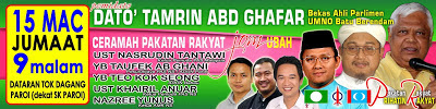 | Ceramah Pakatan Rakyat DUN Kota, Parlimen Rembau Posted: 11 Mar 2013 03:46 AM PDT Tarikh : 23 Mac 2013 , Sabtu Masa : 9 mlm Tempat : Bilik Gerakan UPU Kg Legong Ulu, Jln Kota-Astana Raja (Rumah peninggalan Undang Rembau ke 19, Dato' Haji Ipap bin Haji Abdullah) Penceramah : Zulkefly Mohamad Hj Omar (AJK PAS Pusat) Zulhazmi (Peguam Kempen Anti Saman Ekor - KASE) Hj Baharom Bakar (Penyelaras Parlimen Rembau - PKR) Hj Ghazali Mohd Shom (Penyelaras DUN Kota - PAS) Turut hadir : Yusuf Tapar (Pengarah 1 Sekretariat Pakatan Rakyat Parlimen Rembau, Pemangku Ketua Cabang PKR Rembau) Rozmal Malakan (Pengarah 2 Sekretariat Pakatan Rakyat Parlimen Rembau, Timbalan Yang Dipertua PAS Rembau) Semua dijemput hadir Untuk pertanyaan atau sumbangan sila hubungi Izamri 013-2124086 (Pengarah Pilihanraya Pakatan Rakyat DUN Kota) |