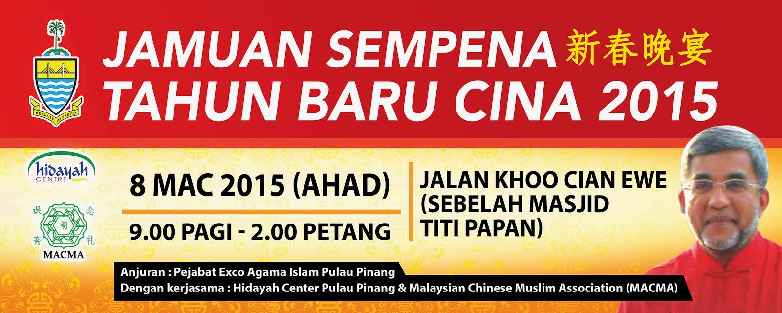 |    JAMUAN SEMPERNA TAHUN BARU CINA 2015 Posted: 06 Mar 2015 02:35 AM PST Pejabat Exco Agama Islam Pulau Pinang, Hidayah Center Pulau Pinang & Malaysian Chinese Assocation (MACMA) ingin menjemput semua rakyat yang berbilang kaum untuk menghadiri Majlis Rumah Terbuka Tahun Baru Cina pada 8 Mac 2015 (Ahad) jam 9.00 pagi hingga 2.00 petang di Masjid Cina Titi Papan. Semua dijemput hadir tanpa mengira kaum, termasuk tokoh-tokoh  pertubuhan-pertubuhan awam, tokoh-tokoh korporat dan sebagainya adalah  dijemput untuk menghadiri serta menikmati jamuan hidangan yang akan  disediakan pada majlis ini. Diharap pengajuran acara ini dapat mewujudkan suasana harmoni antara rakyat jelata yang berbilang kaum dan agama seterusnya dapat membentuk perpaduan. --------------------------------------------------------------------------------------------------------------------------------------------------------- Jamuan Tahun Baru Cina akan turut didakan oleh Parti Keadilan Rayat di Pejabat Ranting Tanjong ( 181 Jalan Arglly (berhadapan Sek Men Perempuan Al-Mansor), dengan anjuran bersama Ranting KOMTAR, Pengkalan Kota, padang kota & Jalan Arglly. Jamuan ini akan berlangsung pada 8 Mac 2015 (Ahad) jam 5.00 petang hingga 7.00 Malam. Semua dijemput hadir bagi memeriahkan lagi acara ini dan seterusnya dapat mengiratkan perpaduan dikalangan ahli dan rakyat (khusunya).  |